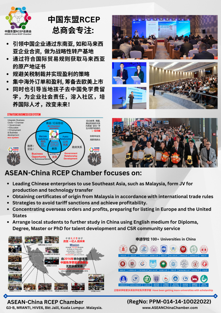Founding History: In view of the establishment of RCEP, business leaders in China and ASEAN countries recognized the need to have a non-governmental, non-profit and independent business association to promote, develop and enhance mutually-prosperous commercial, cultural and community relations between ASEAN and China businesses and organizations by capitalizing the RCEP framework. ASEAN-China RCEP Chamber (ACRC) was officially registered under Registration of Society (RoS) Malaysia and has been actively engaging its members by providing resources, networking opportunities and support for business community in ASEAN & China.